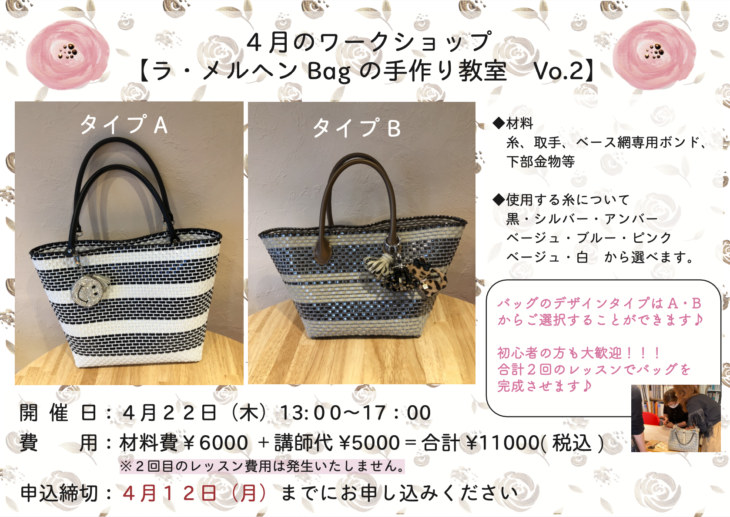 前回大好評だったラ・メルヘンBagの手作り教室の2回目が開催されます!