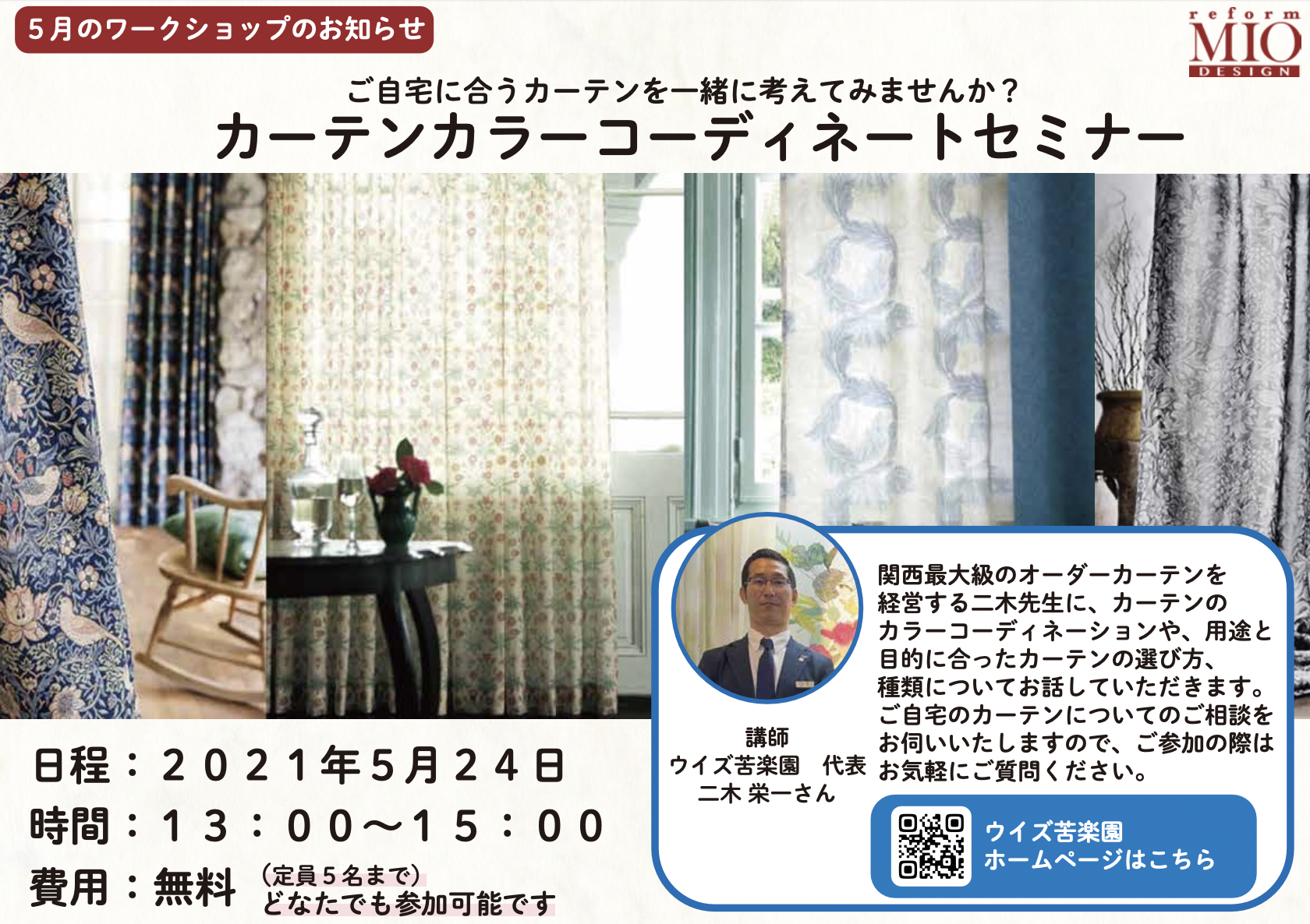 0 HOMEイベント・チラシ情報相談会【どなたでも無料参加頂けます】カーテンカラーコーディネートセミナー 【どなたでも無料参加頂けます】カーテンカラーコーディネートセミナー(終了しました) 開催日時 2021年5月24日(月) 13:00〜15:00(約2時間程度)(会場:有限会社ミオ・デザイン) 詳しくはこちら > 会場 有限会社ミオ・デザイン 開催日時 2021年5月24日(月) 13:00〜15:00(約2時間程度) 参加費 無料 定員 5名様まで 一言 どなたでもご参加できます♪ 相談会一覧はこちら イベント・チラシ情報一覧はこちら ミオ・デザインについて 選ばれる理由 会社案内代表挨拶会社概要企業理念アクセスマップ 社長ヒストリー SDGsへの取り組み 施工事例 施工事例一覧 戸建全面リフォーム マンション全面リフォーム 子供部屋リフォーム 水まわりリフォーム 収納リフォーム 店舗リフォーム 外回りリフォーム お客様の声 お客様の声一覧 お役立ち情報 風水リフォーム JIOリフォームかし保険 イベント・チラシ情報 リノベーションの流れ よくある質問 SDGsへの取り組み お問い合わせ お問い合わせ イベントお申し込み TOPへ戻る ホーム 会社案内 選ばれる理由 会社案内代表挨拶会社概要企業理念アクセスマップ 社長ヒストリーSDGsへの取り組み 施工事例 施工事例一覧 戸建全面リフォーム マンション全面リフォーム 子供部屋リフォーム 水まわりリフォーム 収納リフォーム 店舗リフォーム 外回りリフォーム お客様の声 お客様の声一覧 お役立ち情報 風水リフォームJIOリフォームかし保険イベント・チラシ情報リノベーションの流れよくある質問SDGsへの取り組み お問い合わせ お問い合わせイベントお申し込み © 2019 有限会社ミオ・デザイン