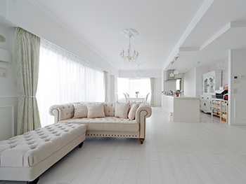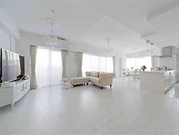 | ご提案内容 | フレンチテイストに仕上げる為、イメージカラーは全て白・ゴールドに統一。モールディングという部材を使い、壁の框と、天井まわり縁、ドア枠まわりに取り付け、シャンデリアにもこだわり、天井にメダリオンを取り付けています。30帖ものリビングは、元々のリビング・洋室・和室の3つの部屋を繋げて一つの広々リビングへと間取りを変更しました。リビングが広くなった分、遊んでいるお子様の様子がよく分かるようにキッチンは壁を撤去し、オープンキッチンにしました。マンションでもオープンキッチンができるプランです。 |