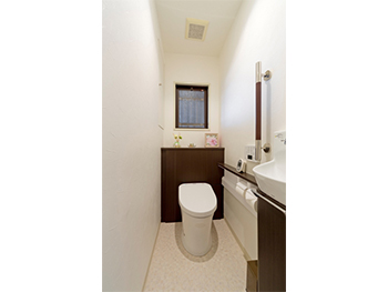 便器はウォシュレット一体型のものに取り替え、タンクが隠れてさらには収納もできるキャビネットを取付けました。予備のトイレットぺーペーパーやお掃除用具も収納できてキレイなトイレ空間が保てます。