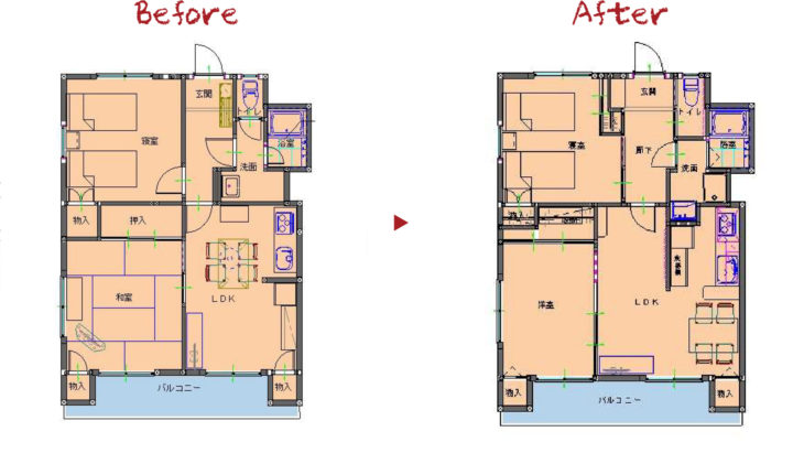 | お客様のご要望 | 広いリビングにしたい!トイレ専用の扉が欲しい!というお客様の強い要望から始まった今回の全面リフォーム。 |