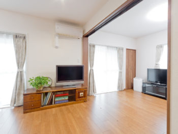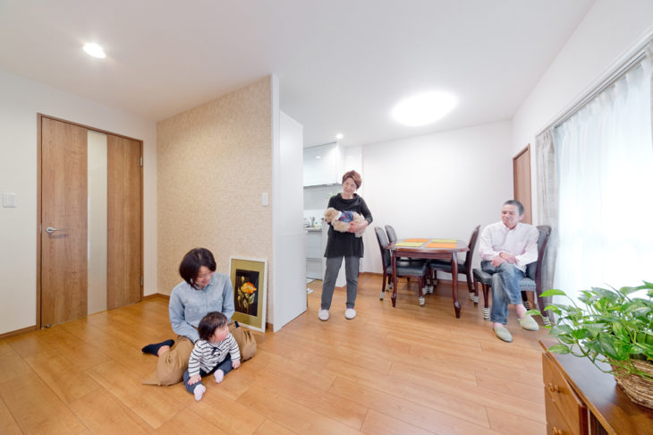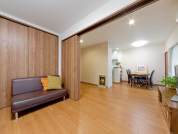リビングと和室の間仕切り壁を撤去し、全面開口部としたことで、一面リビングとして使用可能となりました。来客等の際には個室としても使えるように開口部は引込戸を採用。ライフスタイルに応じて間取り変更可能な広々リビングとなりました。