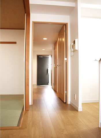 リビングから廊下までフローリングの目を通すことで、玄関の方まで開放感が出ました。 建具の色とも相性が良いので、床材を貼り替えただけですが既存のドアと一体感があります。