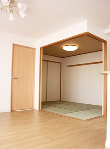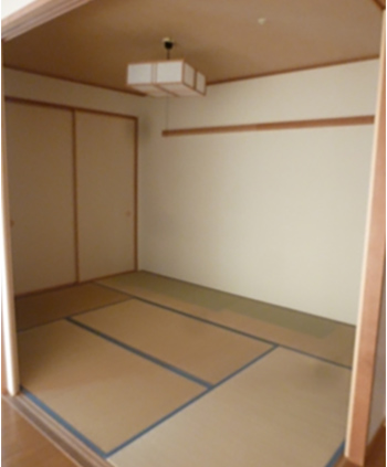 和室の印象を決めるのは、畳縁です。リフォーム前は薄いブルーの畳縁が入っており少しさっぱりとした印象でした。畳を貼り替え、暖色の畳縁にすることで、リビングとの繋がりも生まれやわらかい雰囲気になりました。