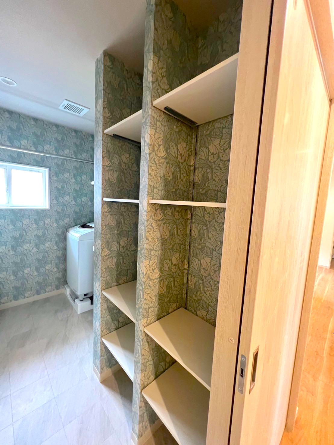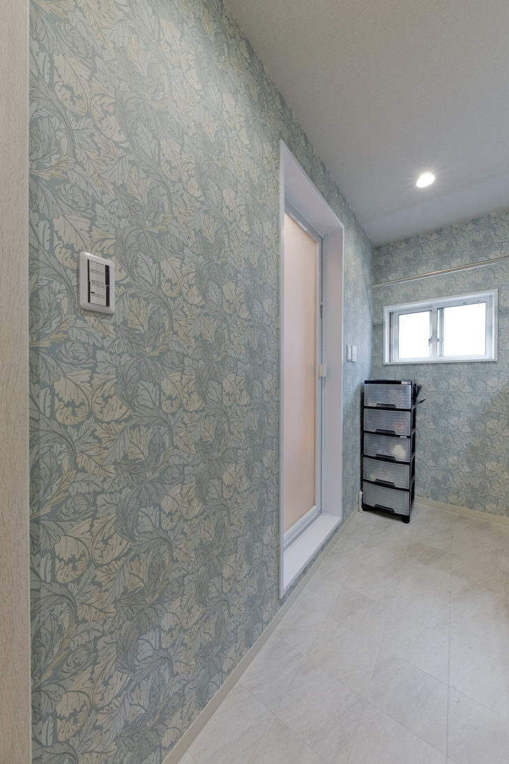 雨の日も脱衣所内で洗濯物を乾燥できるようにハンガーパイプも設置しています。出来るだけ収納スペースを作って欲しいというお施主様のご希望で、収納棚を多めに作っております。クロスは、お施主様が好きなボタニカル柄で爽やかな脱衣所に仕上げました。