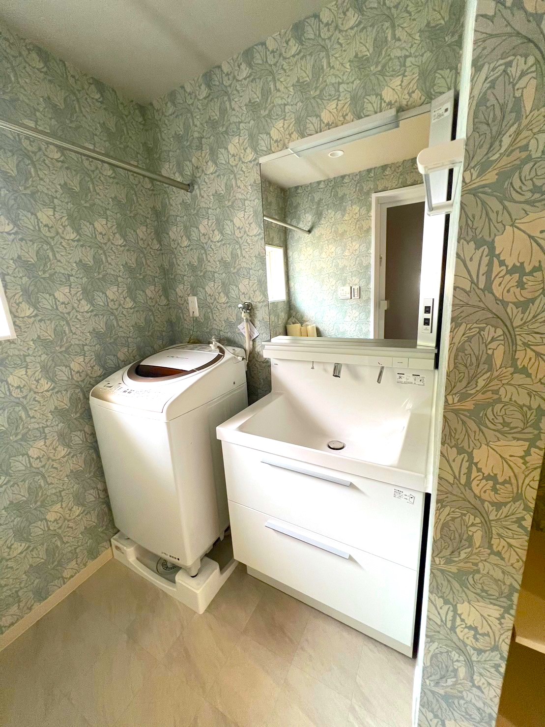 ご両親から相続された築56年の家の一階を助産所、2階を御施主様家族の居宅とするためにリフォームの御希望でした。 居住スペースである2階の脱衣所スペースについても、余裕のある広さを確保しています。 また雨の日も脱衣所内で洗濯物を乾燥できるようにハンガーパイプも設置しています。 お施主様が好きなボタニカル柄で爽やかな脱衣所に仕上げました。 |