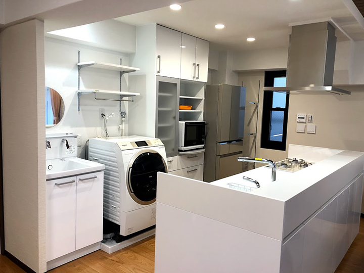 奥様よりリノベーションの御依頼いただきました。戸建てですが、ワンルームの様に1階だけを全面リフォームさせていただきました。 女性らしい雰囲気の御部屋にされたいとのことでしたので、床材はホワイト色で統一し、各室のクロスは、随所にアクセントクロスなどを使用しながら、明るく、楽しく、過ごしていただけるものを提案し、施工させていただきました。 LDKのカーテンや玄関マットなどのインテリアの御相談もいただきました。 提案内容にも満足して頂け、生活しながら奥様の気に入ったインテリアを少しづつ購入されながら、快適な空間にされています! 最初のご相談は、キッチンカウンターが欲しいとの御希望でしたので、造作カウンターを設置し、キッチン側からは、家電収納やゴミ箱設置スペースとして利用出来るようにしています。 |
