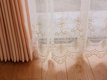 外から家の中が見えないよう、レースのカーテンを採用。とても可愛らしいです。
