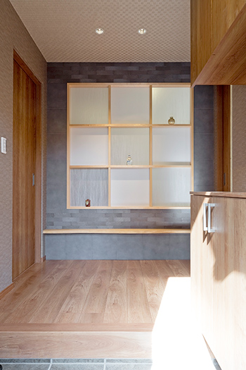 【玄関】玄関を入り正面に見える壁にはアクセントとなるディスプレイを造作し、お家の顔として来客される方が最初に見える部分として引き立つように工夫しています。エコカラット(タイル)やクロスも落ち着きのある和風テイストに合わせ、トーンの低い色味のものを採用しています。