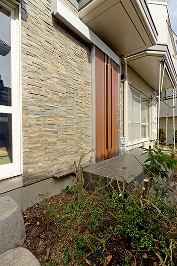 【玄関】玄関扉のまわりの外壁面には、デザイン性のあるスレートの石を貼り玄関まわりは重厚感のある場所となりました。