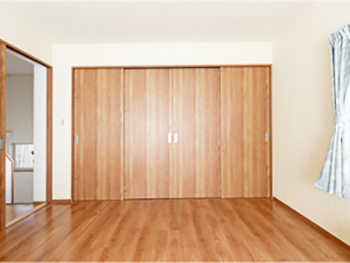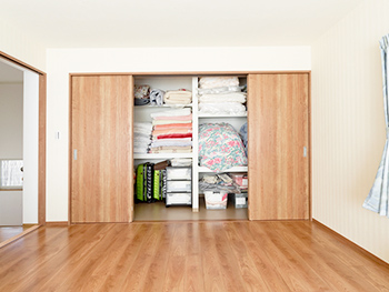 【2階の収納】クローゼット自体の奥行きも1m30cmと少し広めに確保することでクローゼットの中に一歩踏み込んで物の出し入れが楽にできるように工夫しています。扉は4枚引き違い扉にすることで、最大で扉2枚分の開口が確保できるためスムーズに大きい物を取り出す事が可能です。
