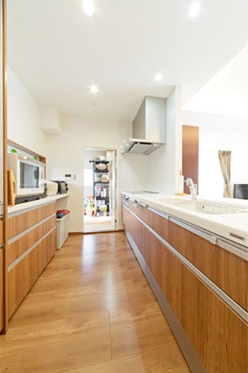 【キッチン】レイアウトは大幅には変更せず、収納力やお掃除のしやすさでキッチンを選定していきました。奥様が最後まで悩まれていたのが、対面キッチンに腰壁を造るかどうかでした。手元が隠れるくらいの高さまで壁があれば、少々キッチンが散らかってしまってもリビングからは見えないですが、可愛いお嫁さんのご希望でもあるオープンスタイルのキッチンへとなりました。背面収納もカウンターをメインにし、高さを揃え圧迫感の無いようにしています。フローリングと合わせたキッチンの扉柄も奥様のお気に入りになりました。
