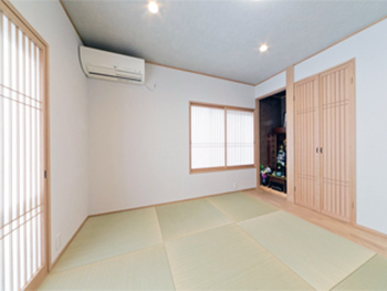 【和室】お客様が来られた際には、和室で集まるというH様邸。リフォーム前は6帖の和室でしたが、お客様がたくさん来られる事が多いので8帖へと広げました。雰囲気の良い琉球風畳を入れ、そのまわりには、押入の扉を開けた時に畳が擦れないように無垢のナラ板を貼っています。