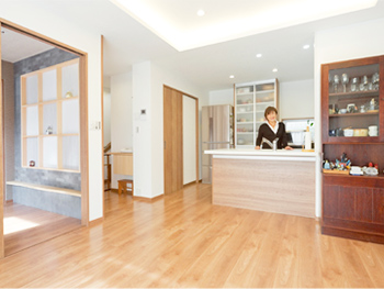 【リビング】キッチンの対面壁を無くしたことでリビングとキッチンが繋がり、LDKが広くなりました。リビングの天井は中央部分を高くして折り上げ天井とし、その中に間接照明を取り付たのでリビング全体が柔らかく広く感じられます。天井の折り上げ部分には間接照明を取り付けたので、ふわっと天井が光り、とても雰囲気も良くなりました。フローリングはパナソニックの幅広タイプのものを採用し、お部屋を広く見せる効果があります。リフォーム前と後とでは広さ自体は変わっていませんが、少しずつの工夫で全体的に広く、明るくなりました。リビングとキッチン、洗面室、和室の床下には断熱材を敷き込み、キッチンとリビングには温水床暖房を設置したので足下から温かくなり今まで寒かった室内での動きも楽になり部屋の温度差の解消もしています。