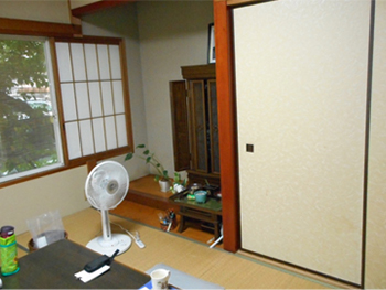 【和室】少しでも板間があればテレビやその他の重たい物を和室に置きたい時に畳の上に置かなくていいので、畳が沈むこともありません。壁は珪藻土を塗り、調湿効果や消臭効果もあるので、清々しい空気が流れ客間としても気持ちの良い空間となりました。障子も造り直し、押入の収納扉も障子と同じデザインで造っているので統一感があります。