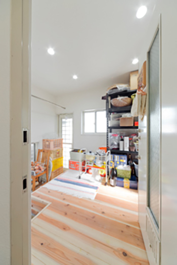 【野菜室】 H様はご自分の自家農園で無農薬の玉ねぎ、じゃがいも等を作っておられその野菜の保管庫を今回のリフォームで作りたいとのご希望でした。キッチンの勝手口の外部に、野菜室を設け、室内からと、屋外からとどちらからも出入りができるようになっています。室内からは、無垢の杉板が貼られた床へ出ることができ、室外からは、コンクリートの土間の床へ出るので靴のままでも汚れる心配がありません。1本だけ取り付けたパイプハンガーには、お野菜を干す時に吊り下げる事ができます。