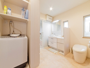 【洗面・トイレ】洗面室とトイレを同じ空間にまとめ、ホテルのようなサニタリールーム空間を造りました。洗面室の扉を開けて一番近い場所に洗濯機スペースをつくり、重たい洗濯物を運ぶ距離を少しでも短くできるように設定しています。オリジナルの収納キャビネットを造り、少しのスペースでもタオルや洗剤が収納できるようにすることで、洗面室内に物が散乱せずスッキリと収まるようになりました。造作で全て造ったキャビネットの為、隙間なく収まっています。
