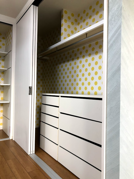 これまで和室だったお部屋を洋間にリフォームしたいとのご要望を頂き、フローリングの張替えとクローゼットを新しく作りました★ 2か所にクローゼットを作り、一つはお洋服を収納できるようにハンガーワイプを設置して、もう一つのクローゼットには収納で有名な近藤典子さんが監修されたリクシルさんとの合同製作のヴィータスパネルを取り付けています。 またクローゼットのアクセントクロスがポイントになります! 余ったスペースは旦那様のご要望で、ご家族で共有頂けるデスクと収納棚を作らせて頂きました。 |