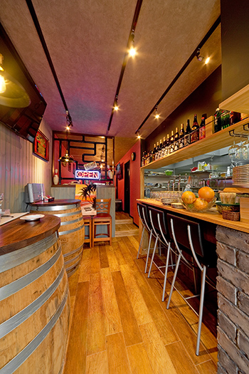 外壁には古煉瓦調の輸入ブリックタイルを一階の正面に貼り、2階は同系色のグレーに塗装しました。重厚感のある木製の入口扉は、ミオ・デザインでオーダー製作しています。小窓からは店内で、焼き豚を焼いている様子が見えるようにし、お店の前を行くお客様が入店しやすい様に工夫しています。工期には2か月を要しましたが、施主様こだわりの店舗になり、大変ご満足いただくことがました。