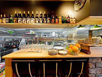 厨房は、作業台側は対面式で客席に向かっています。シンプルで、作業効率が良いように、レイアウトして設置しています。