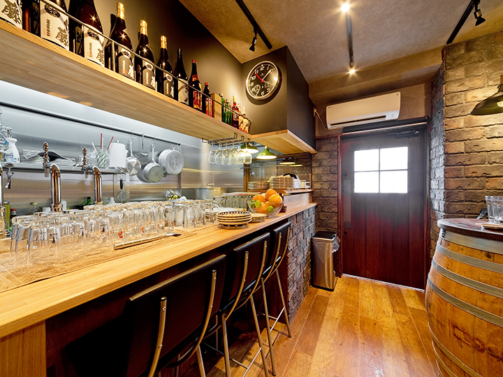 店内に入ってすぐのスペースには、厨房との境にカウンターを設け、フランスのブリックタイルを貼り、少しレトロ感を出しています。テーブル席には、古樽を使ったオーダー樽テーブルを造作しています。店内の壁は無垢のパイン材を壁一面に貼り、その上に塗装を施しています。ペールブルーグリーンの微妙な色合いはお施主様とミオスタッフ、職人さんで話し合いを重ね、現場で調合しオリジナルの色で塗装をしています。