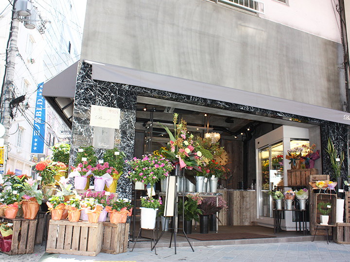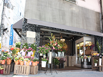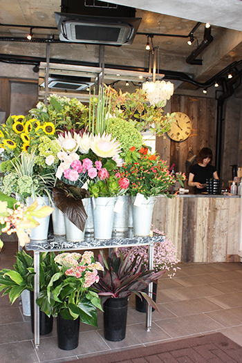 お店の中央には大理石の大きなテーブルを置き、たくさんのお花を引き立てています。